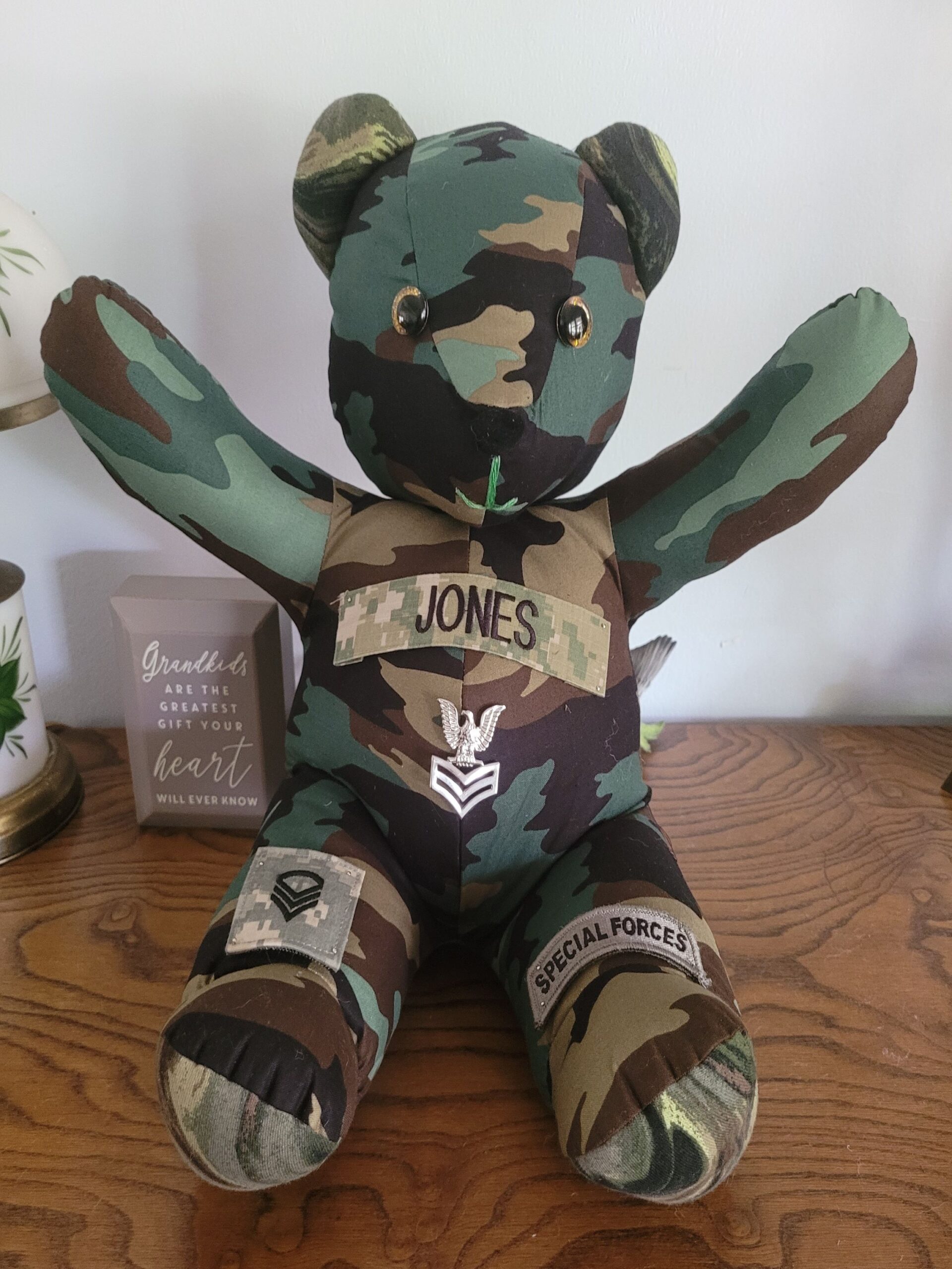 - Made from Your Loved One’s Military Uniform: Send us the fabric, and we’ll create a cherished bear. (1-2 adult shirts needed)